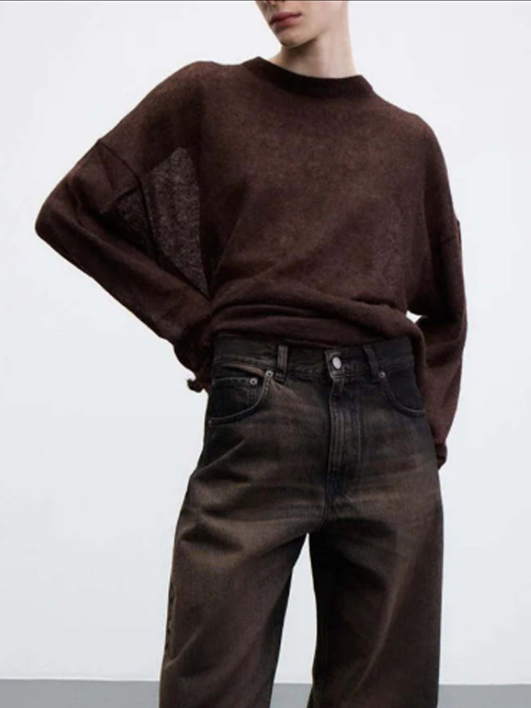 The Blair Sweater in Brown by Haikure is a crew neck sweater featuring ribbed trims and an open back crafted in a soft knit.