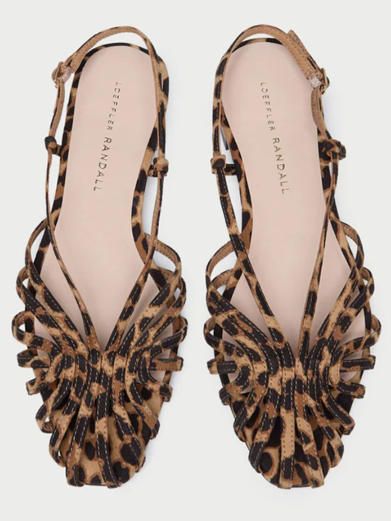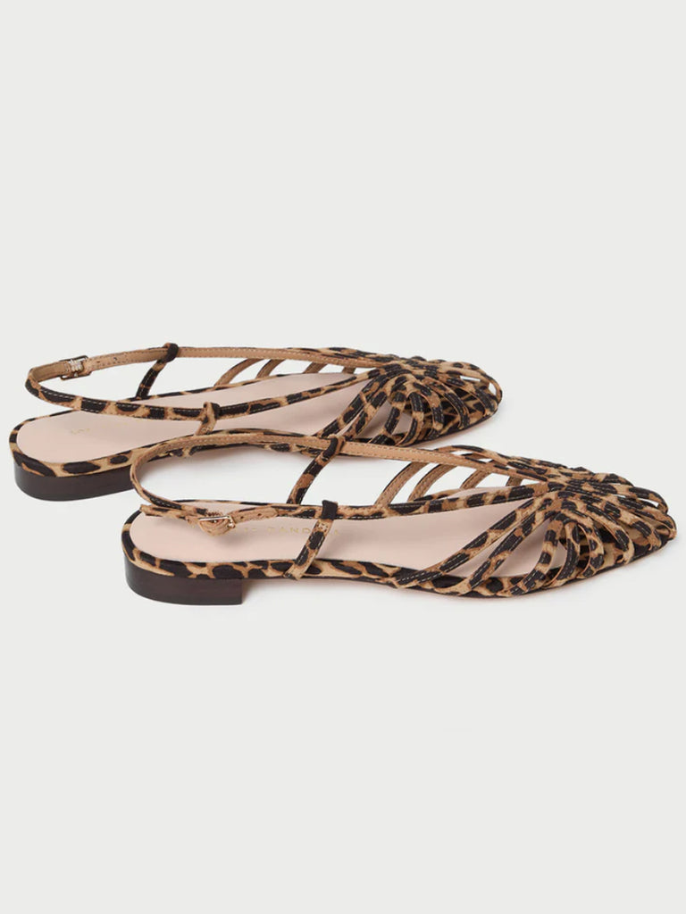 Flat sandal in leopard faux suede. Features a latticed strap design, an adjustable slingback strap with a buckle closure, and a padded footbed with a gold-stamped logo.