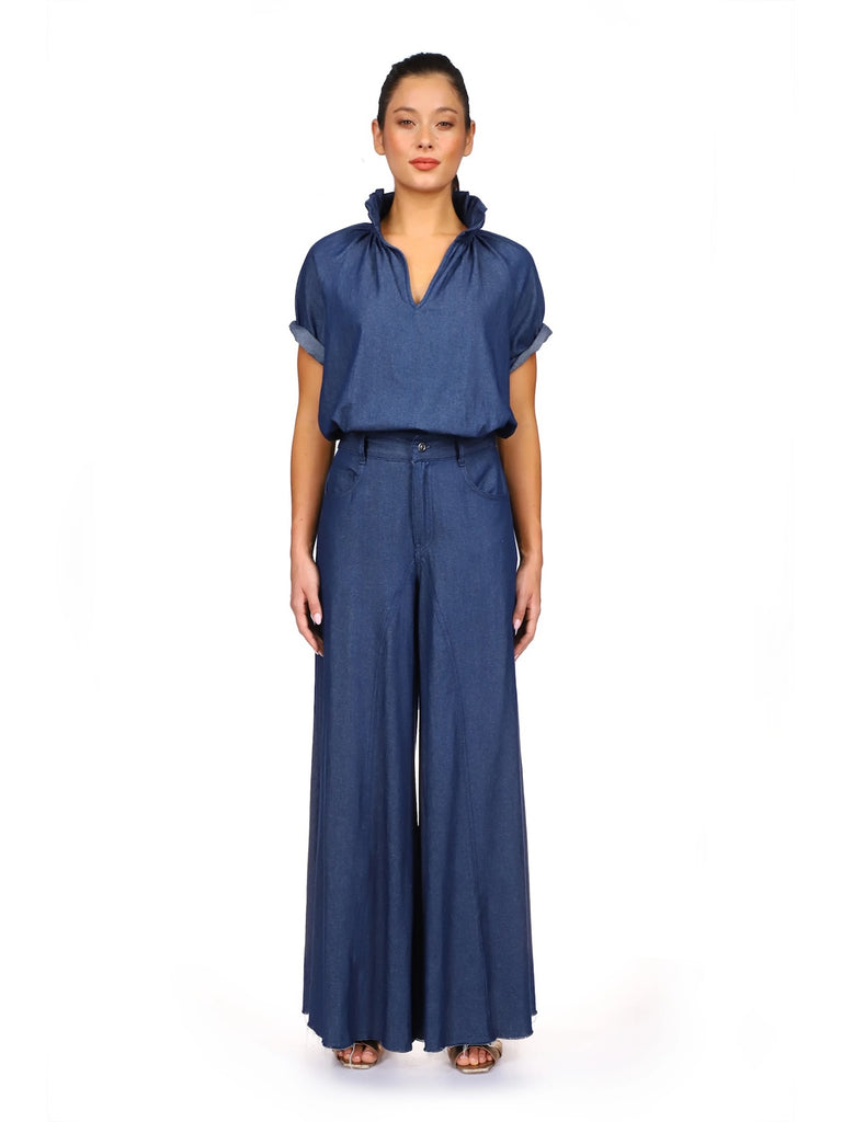 Exaggerated wide legs, front pockets & back pockets. The back waist is encased with elastic allowing for a super comfortable fit. Made with high-quality denim, these wide leg pants provide a relaxed fit and effortless style. Elevate your wardrobe with this timeless piece.