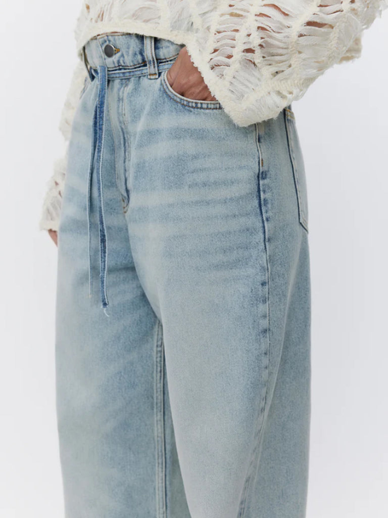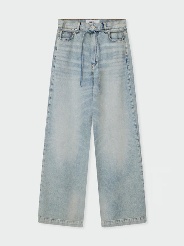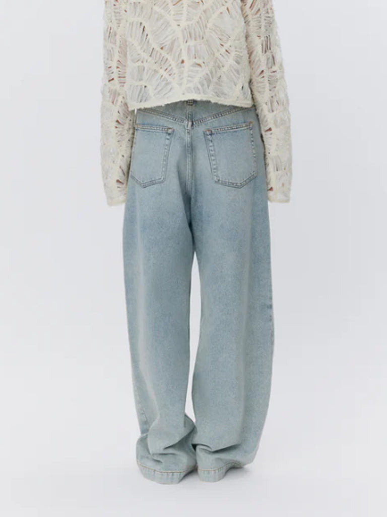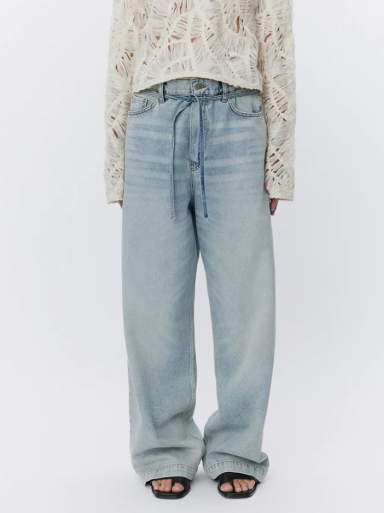 These low-rise, wide-leg jeans feature a zip fly with a button closure, five pockets, and a removable belt. The jeans have a loose fit.