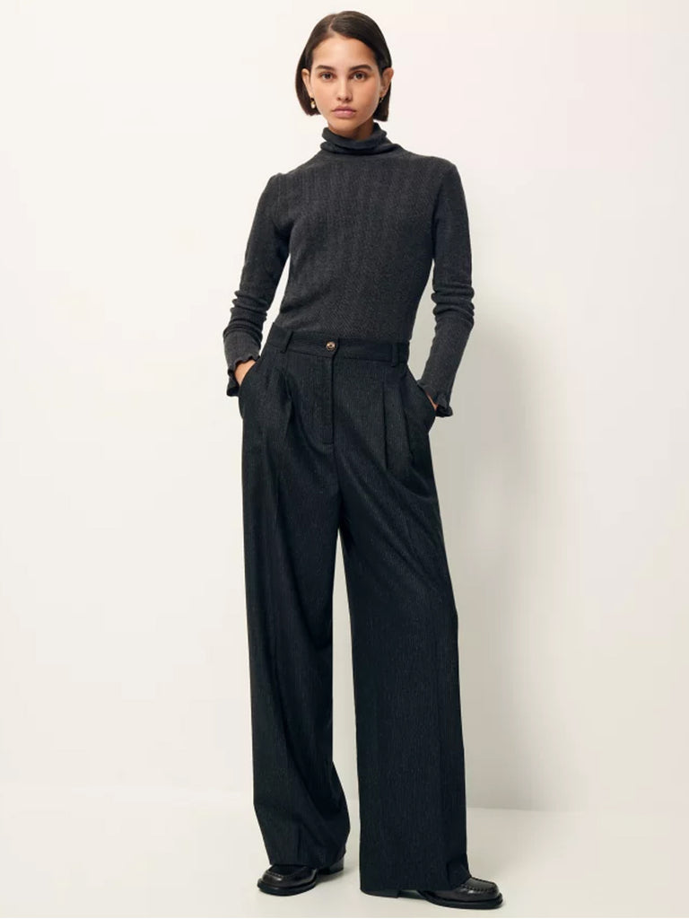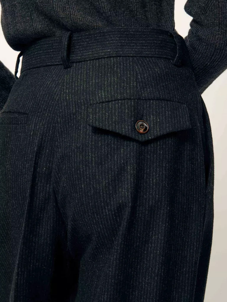 Masculine-style straight pants with knife pleats at the waist in a marengo-striped flannel fabric, woven in Italy.