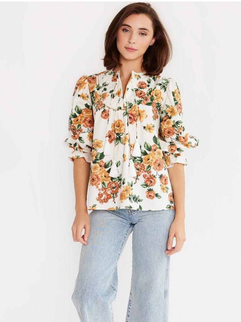 The Guilia top has a loose fitting body with structured shoulders and a quilted bib front. Elasticized cuff with subtle ruffle detail. Available in Antique Rose Floral. 100% cotton. Made in India.