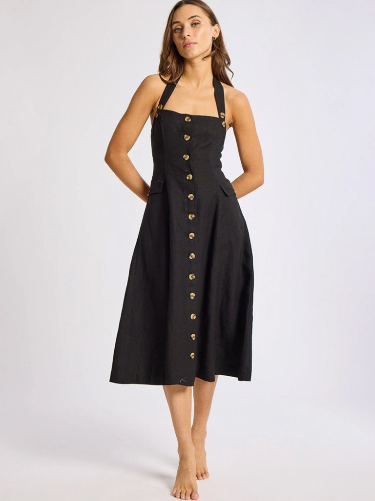 Sophisticated and a little retro, the Isla dress has a wow factor yet is easy to wear. Fit and flare silhouette with adjustable halter strap and a straight neckline. Functional, inset side pockets. 100% Linen