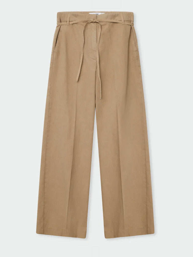 These low-rise, wide-leg trousers feature two side pockets and one back pocket, a zip fly with a hook closure, and a removable tie belt at the waist. The trousers have a loose fit.