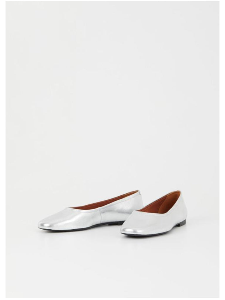 A minimalist ballerina shoes with a timeless silhouette. Silver colored leather with a rounded toe and pretty sole with an .5" low heel. Details include leather lining and leather insoles.
