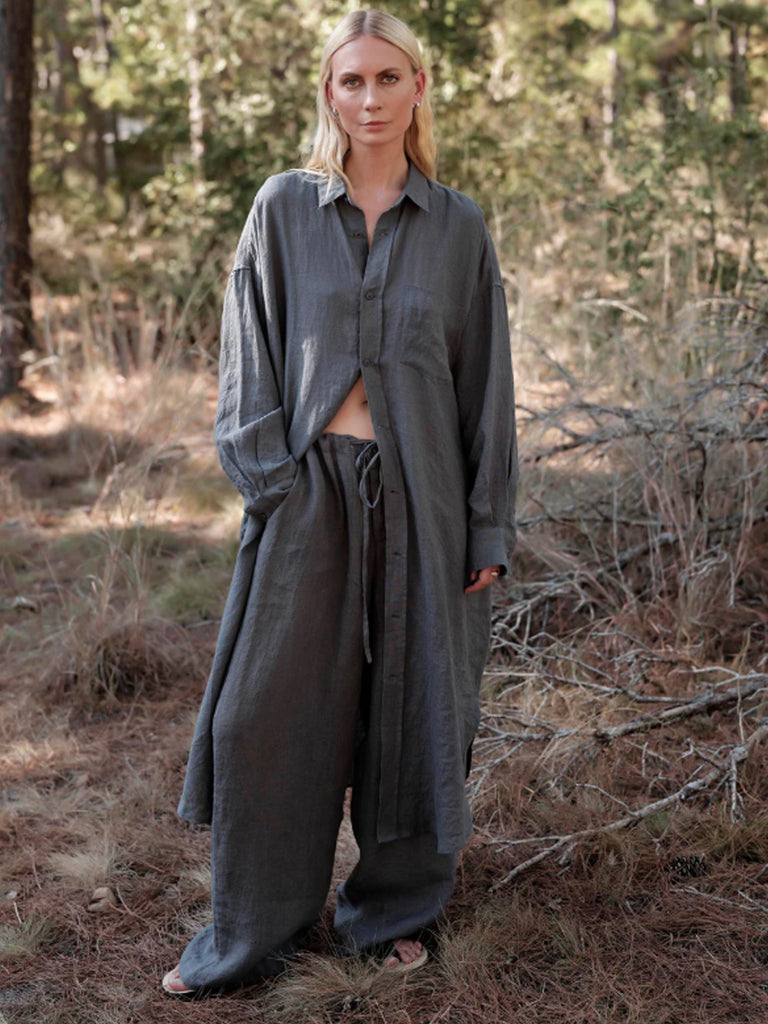 Relaxed pant in a washed linen with a soft hand. Straight leg shape with button front fly, drawstring waist, side pockets.