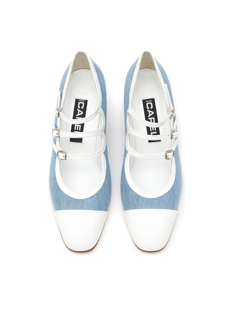 Kiss is the newest iteration of Carel's iconic roster of Mary Janes. Its denim upper offers a modern take, while with the leather toe maintains a retro feel. Block heel for easy everyday wear.