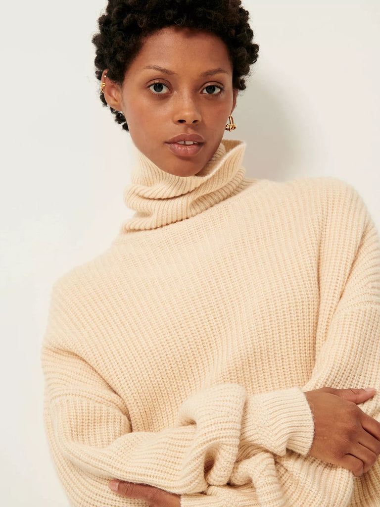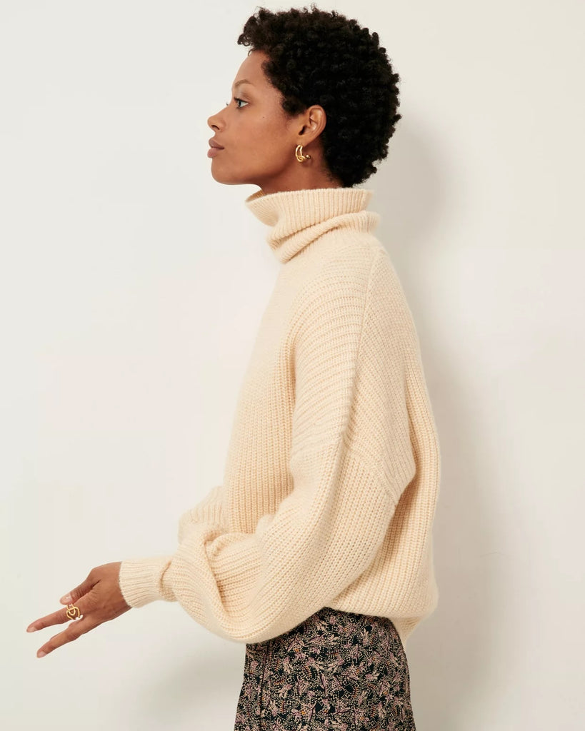 Turtleneck jumper in a fluffy rib knit. 42% Wool 17% Mohair 17% Polyester 14% Acrylic 10% Polyamide.