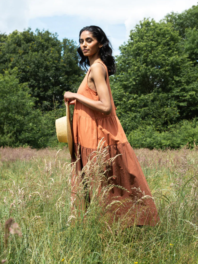 The Noelle dress is a sleeveless, tiered midi dress, with a loose cut A-line body. It features a low scoop back, with a tie to the back neck, and side pockets at the hip.