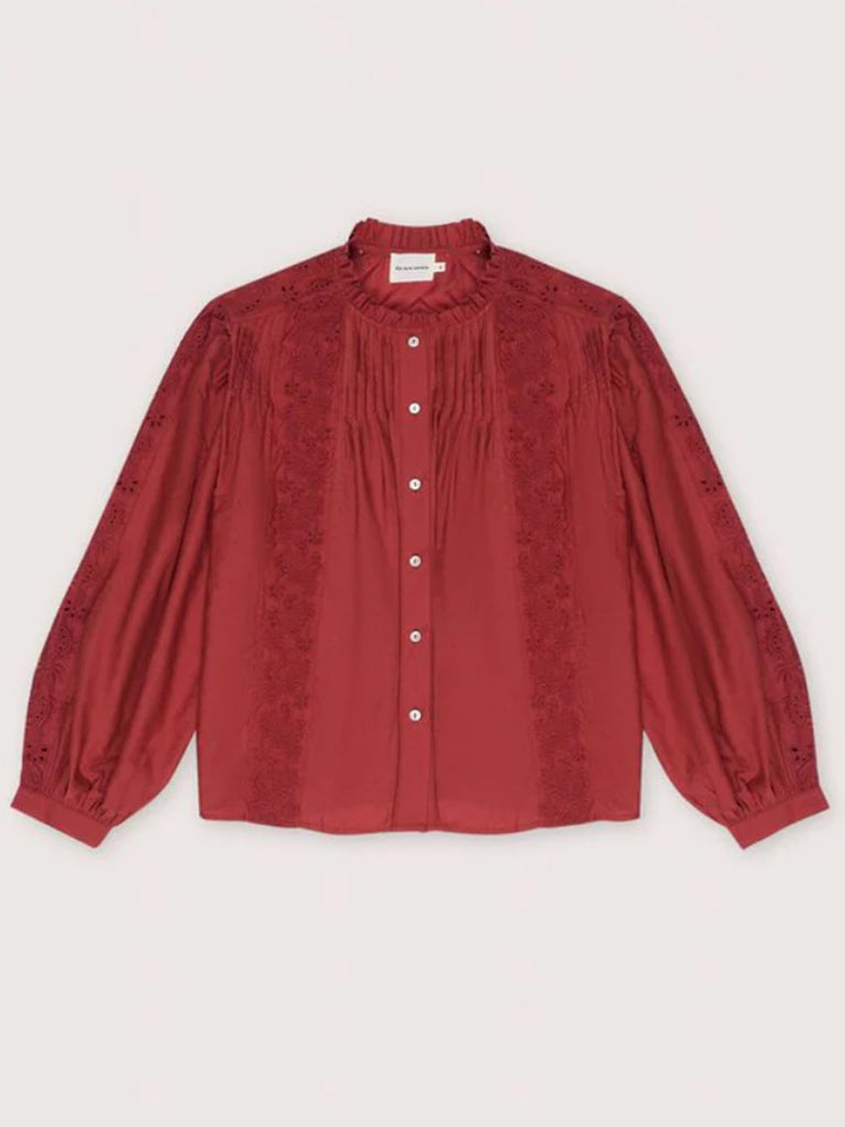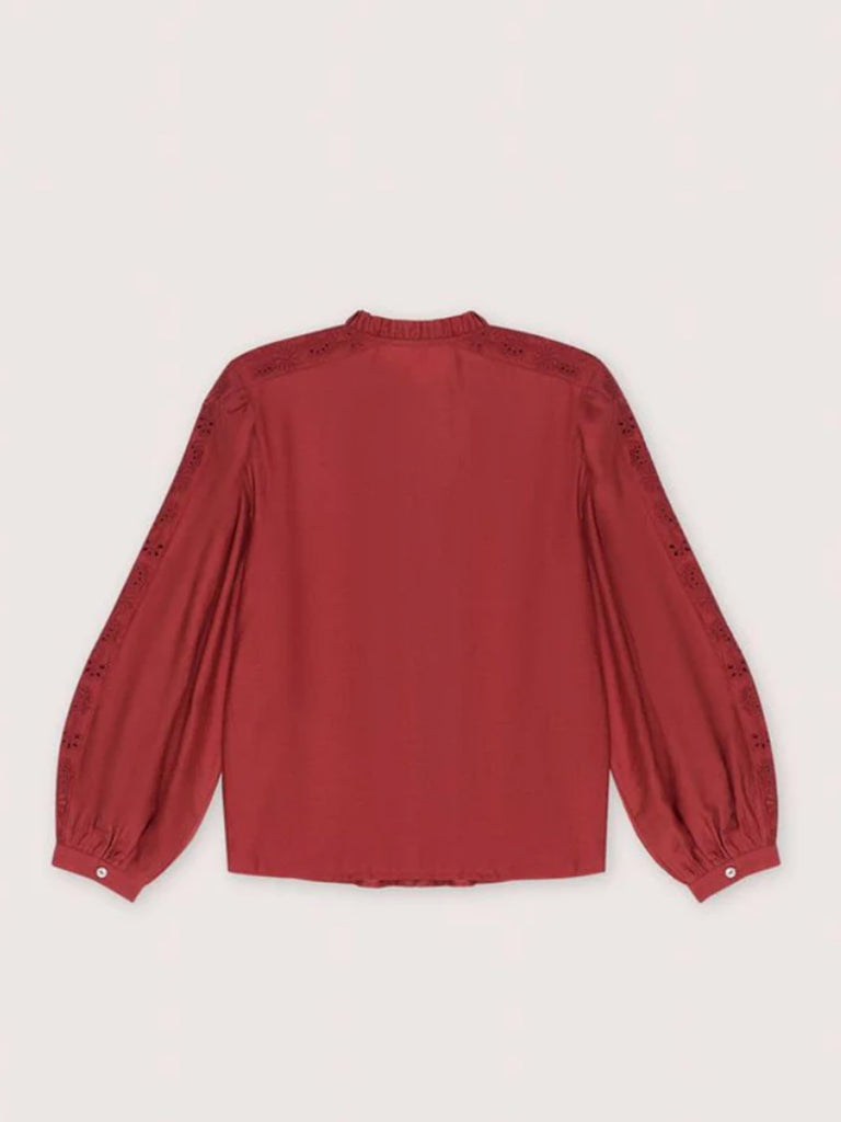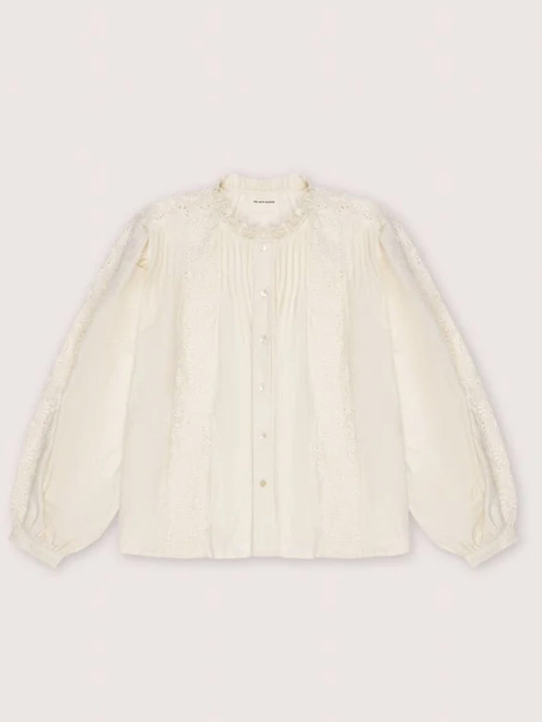 Cotton-silk blouse with delicate embroidery details and pleats. It features a neckline with a small ruffle and sleeves finished with cuffs.