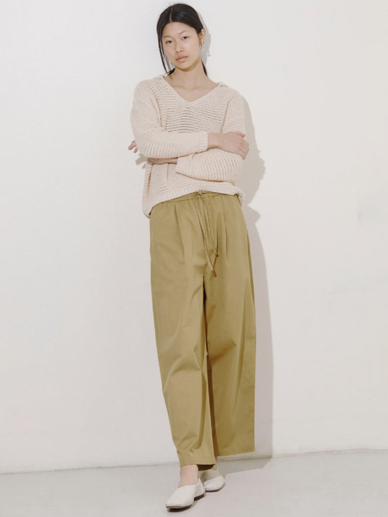 Lightweight pleated trouser with tie waist in a washed cotton. Featuring button front with zip fly and exposed waistband tie. The silhouette is baggy with a slightly tapered leg.