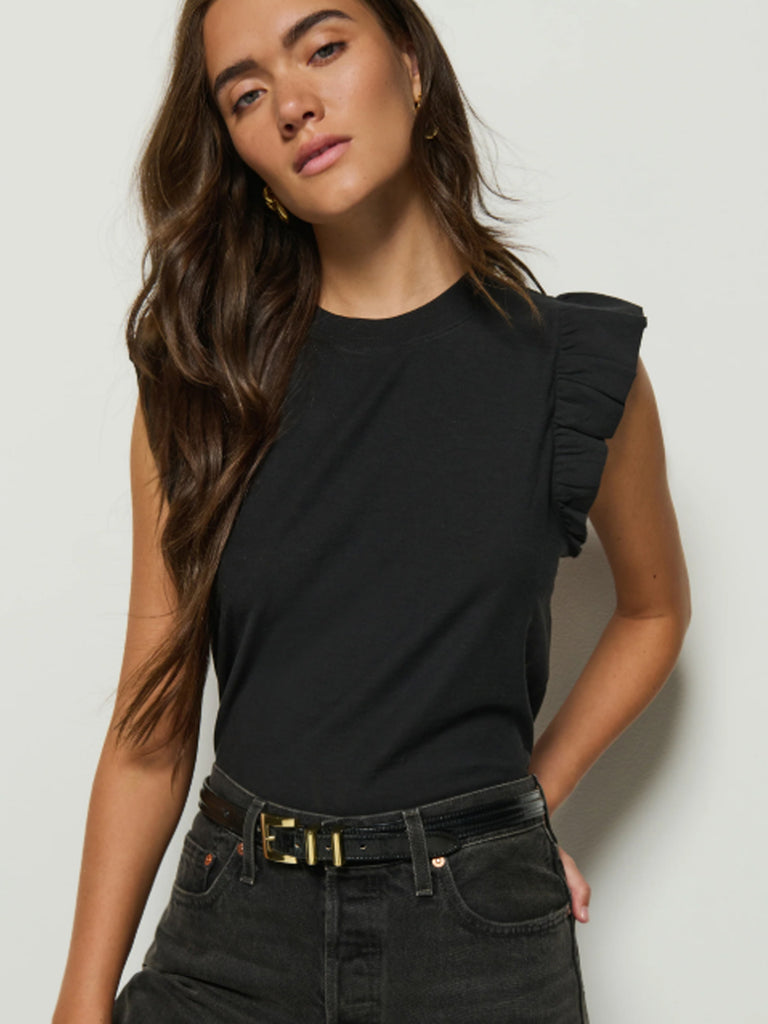 This is not your average jet black, ruffle tank: the ruffles are lightly fused, which adds a little extra kick and makes your waist look smaller. You're welcome. This one comes in Jet Black or Lavendar. Size down for a more fitted look, size up for a little more ease.