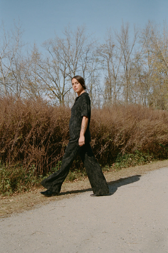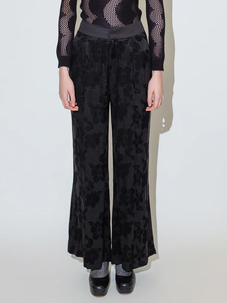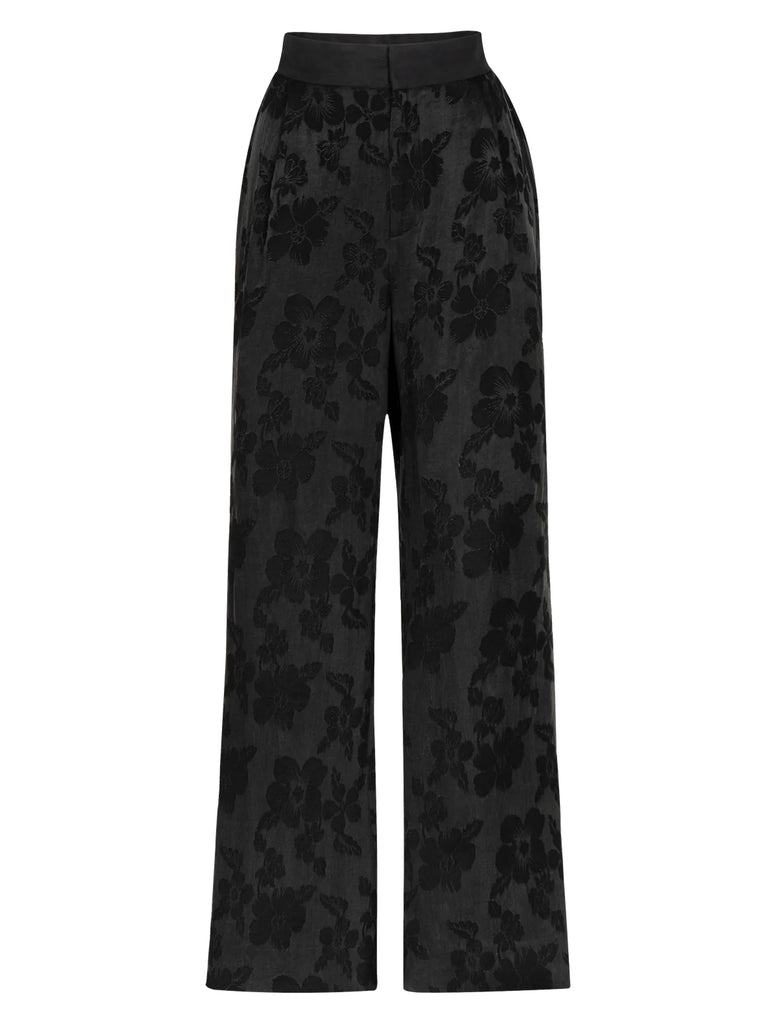The Petra pant is an elegant easy high waisted trouser crafted from a luxurious Cupro/Viscose blend. Featuring a Black Floral jacquard, this flattering silhouette has a single front pleat, a lustrous drapy wide leg with front and back pockets.