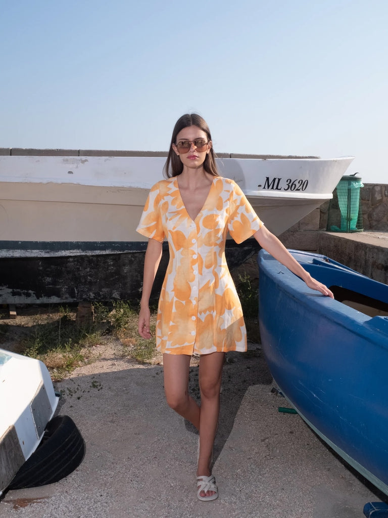 The Shinoa dress is a flirty, day dress crafted from a breathable TENCEL™. Featuring UIM custom hand painted artwork Facula Saffron, a flattering mini short sleeve dress with princess seams for a tailored fit, and beautiful V-neck. Play up its femininity with heels.