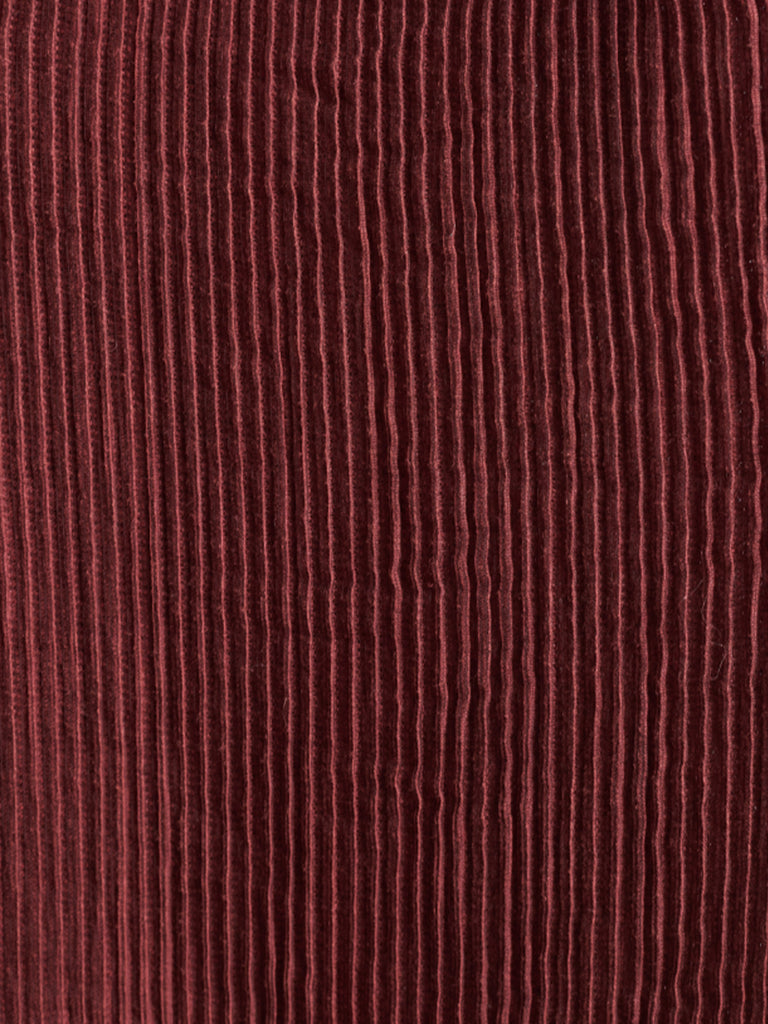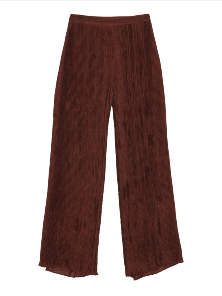 A high-waisted pant with a comfortable fit and a slight flair at the bottom of the leg. Made from a soft fabric that has been carefully pleated in small pleats giving the warm russet brown color extra depth. Made with french seams and an invisible zipper on the left side. The bottom hem is finished with a small babylock, which gives the finish a soft wave.