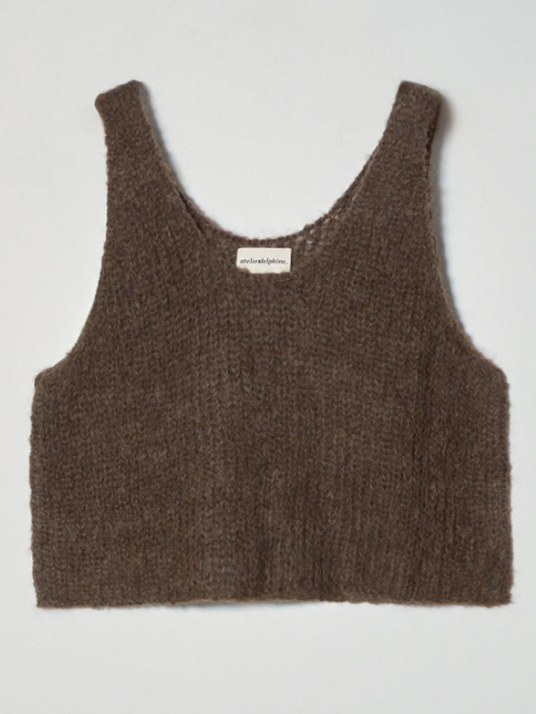 A breezy, ultralight sweater tank for all seasons, in Chocolate Brown. Beautiful for layering or worn on its own. An Atelier Delphine wardrobe essential.