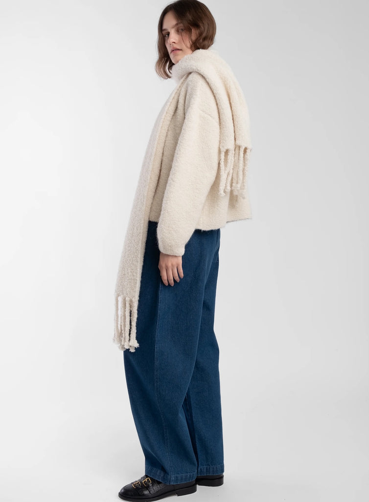 Long scarf in Alpaca blend boucle yarn with twisted fringe at the ends.
