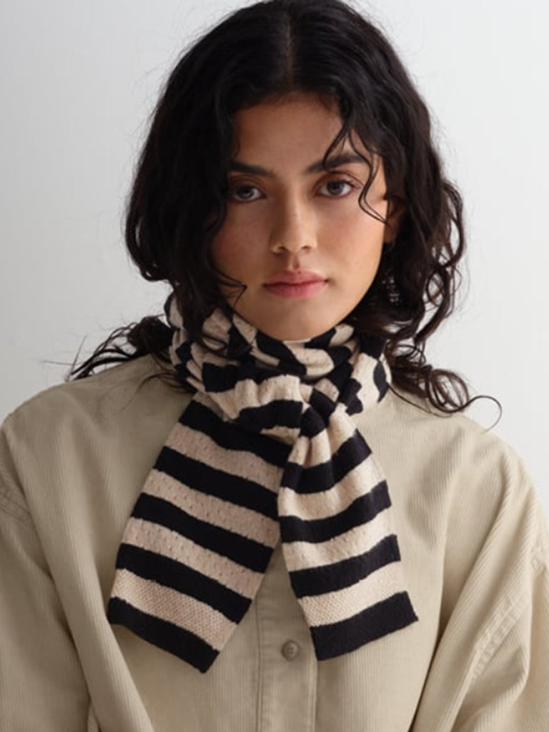 A small all-season double layered fine soft stripe scarf with an all over pointelle stitch.