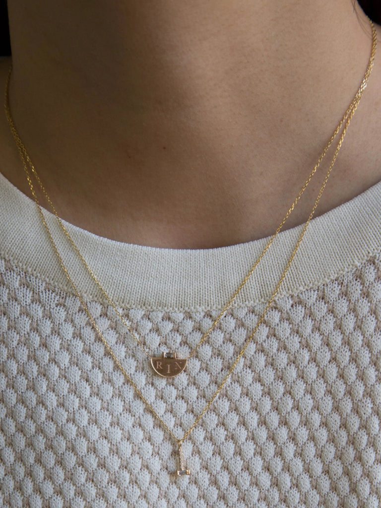 We love signet pieces for how personal they feel. A contoured half-moon with hand implemented milgrain detail, set with a single clean baguette diamond and finished with a satin touch, this necklace is truly special and unique. Engrave her with up to 3 letters or numbers or wear her blank for a modern look.