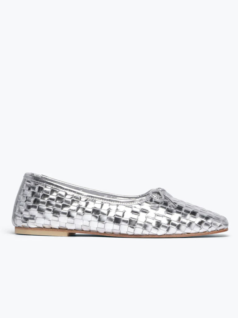The woven ballet flat. Handwoven in silver calf leather, the JADA is equal parts effortless and timeless with its square toe detailing, low-profile construction and functional tie. Both dressy and functional, we love this style with jeans and blazer or baggy trousers.