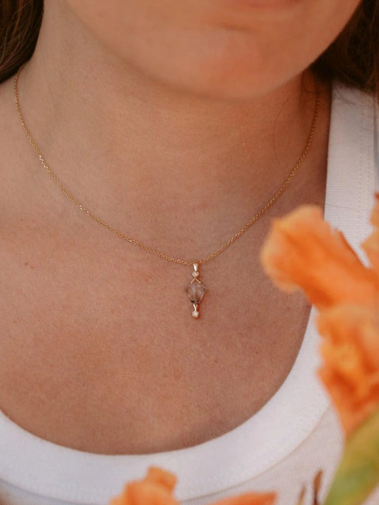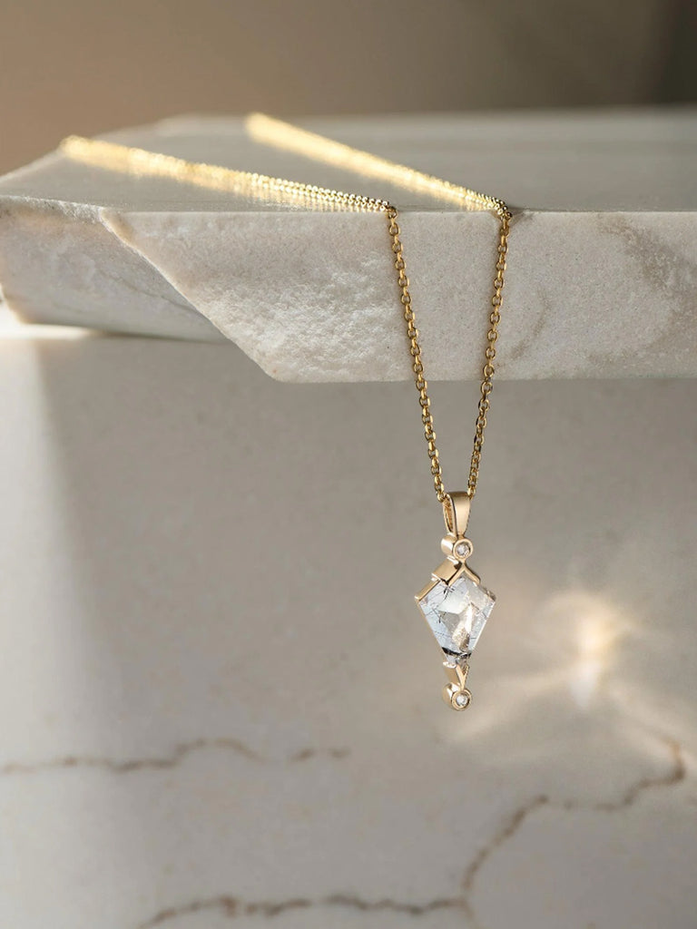 Thin black strands of tourmaline are captured inside this geometric kite cut quartz gemstone and accented with 2 small white diamonds and set in 14k yellow gold. Finished with a solid 14k solid gold cable chain with adjustable link closures at 16" and 18" long.