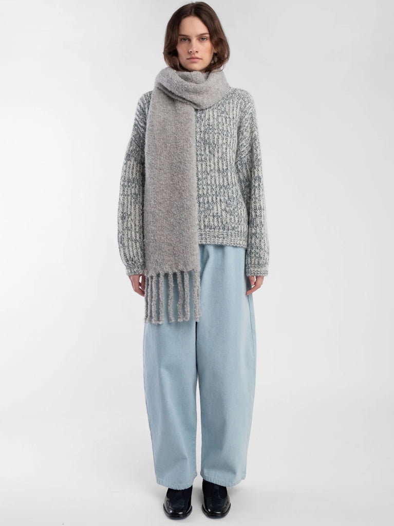 Long scarf in Alpaca blend boucle yarn with twisted fringe at the ends.