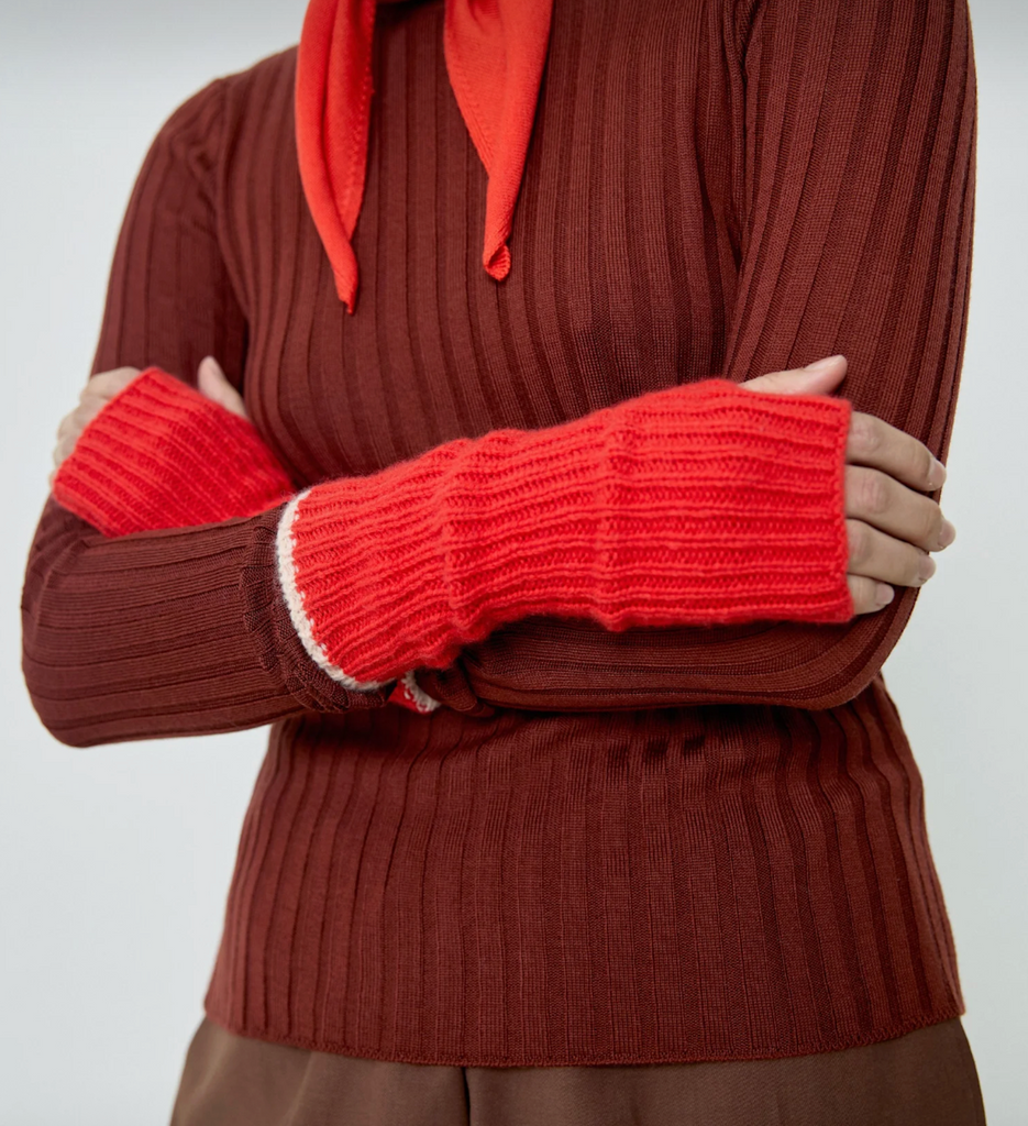 Classic fingerless mittens with a contrasted trim on the edge. Crafted in soft Cashmere and Merino wool yarn with a ribbed stitch pattern. 10% Cashmere 90% Merino. Made in Spain in a local and family-run factory. Hand wash only. Do not tumble dry. Do not bleach. Iron in low temperature. Can be drycleaned.