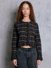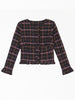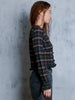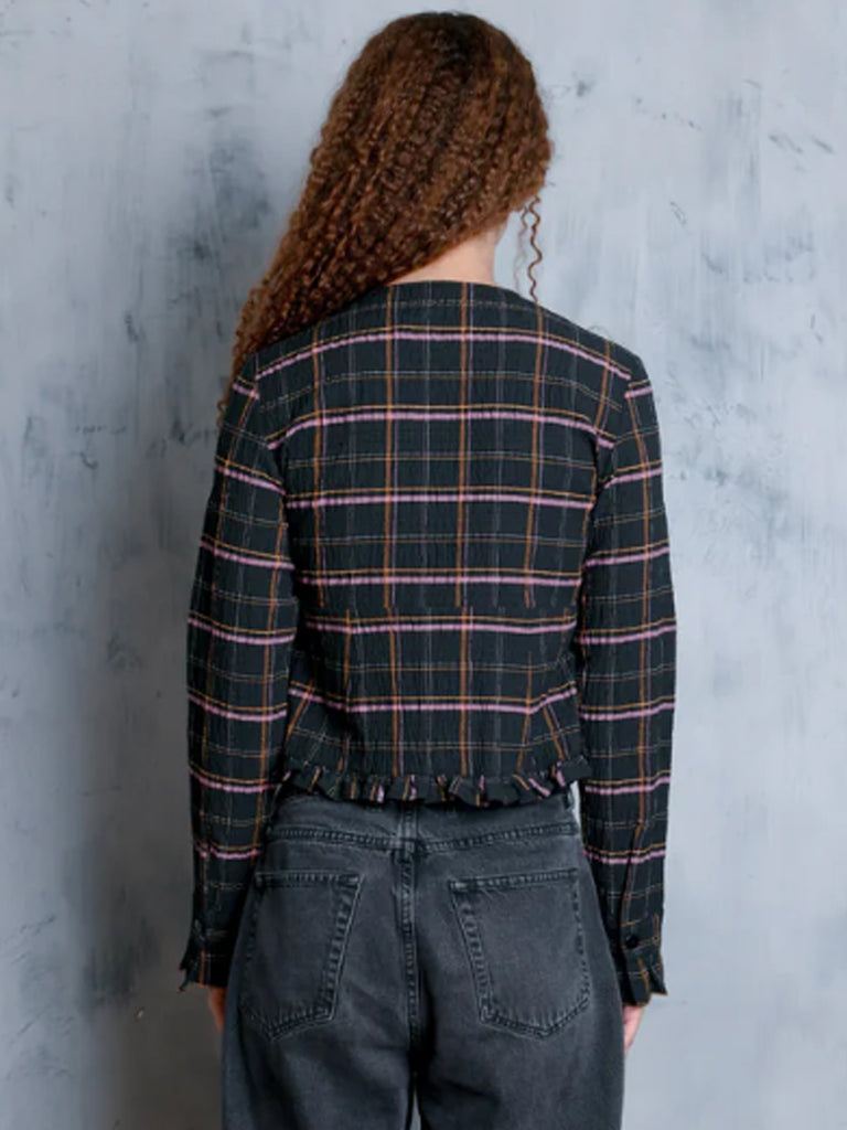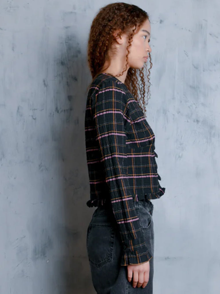 The Amelia Top is a cropped long-sleeve crafted from UIM custom woven stretch crinkle Viv Plaid. Featuring a round neckline and delicate knotted button closures down the front, it’s finished with subtle ruffle edging at the hem, button placket and cuffs for a feminine touch. A structured yet easy silhouette that pairs effortlessly with denim or tailored trousers.