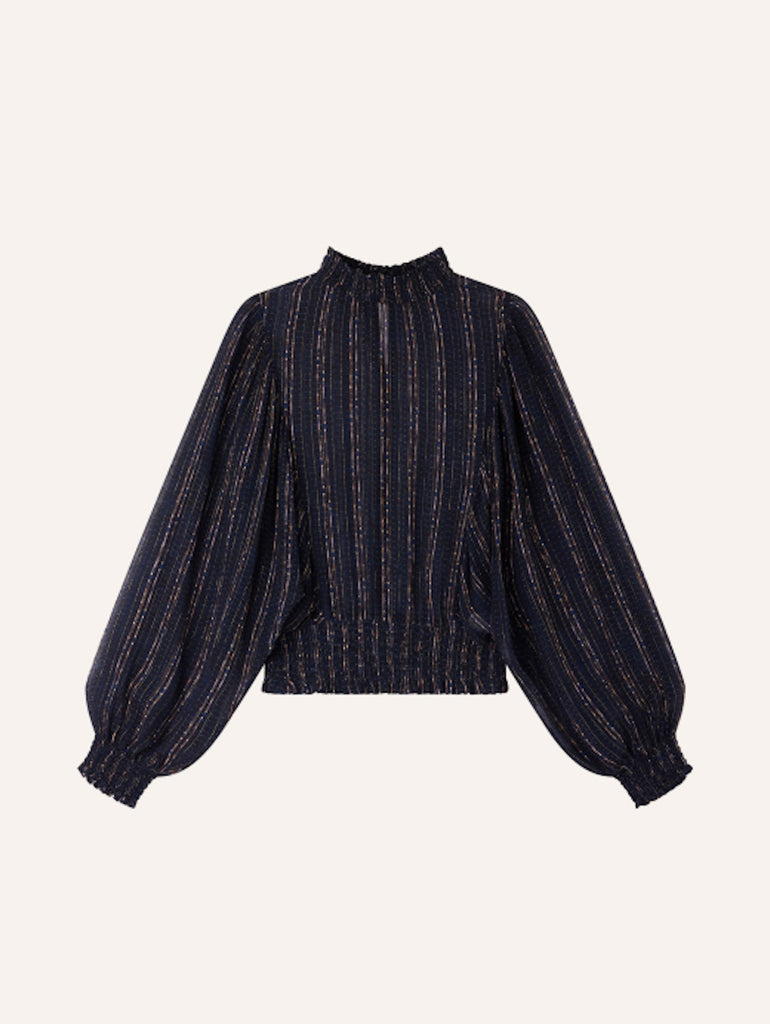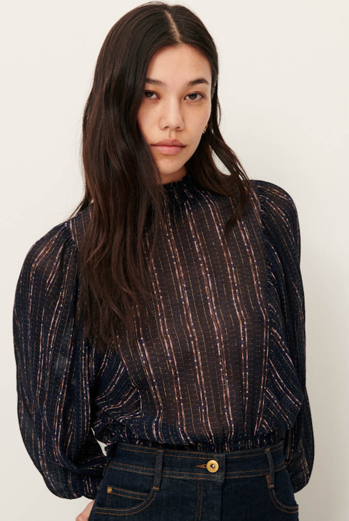 Balloon-sleeve blouse with smocks in printed silk and viscose chiffon crepe, with thin metallic stripes. 82% LENZING™ ECOVERO™ Viscose 16% Silk 2% Metalized polyester.