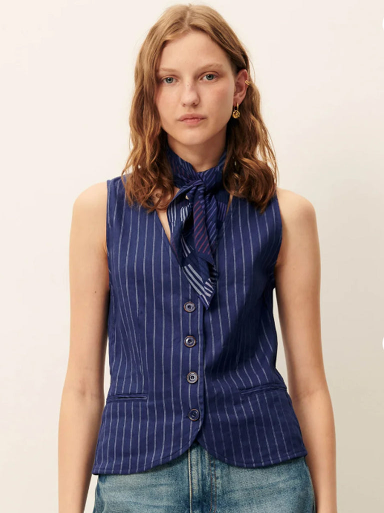 Sleeveless button-down jacket-style top made from soft linen and viscose woven in Italy, featuring a Sessùn-exclusive contrasting thin stripe motif.