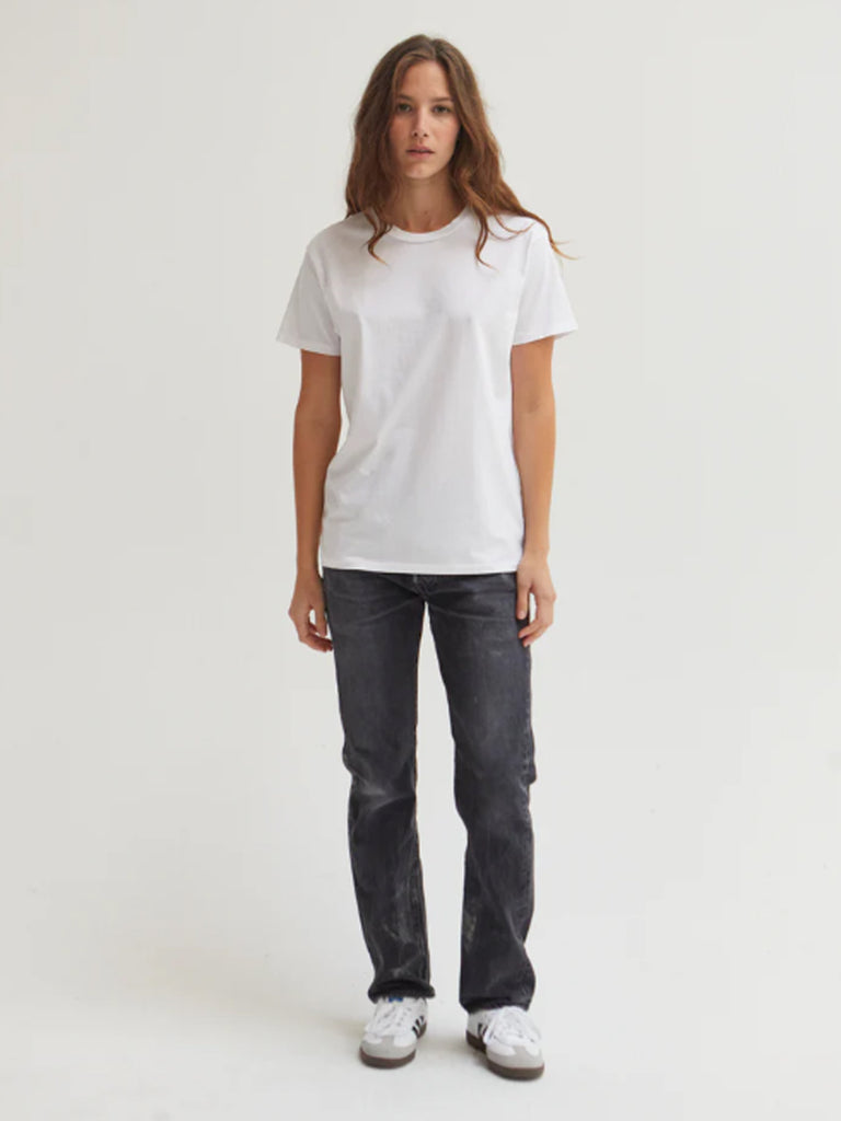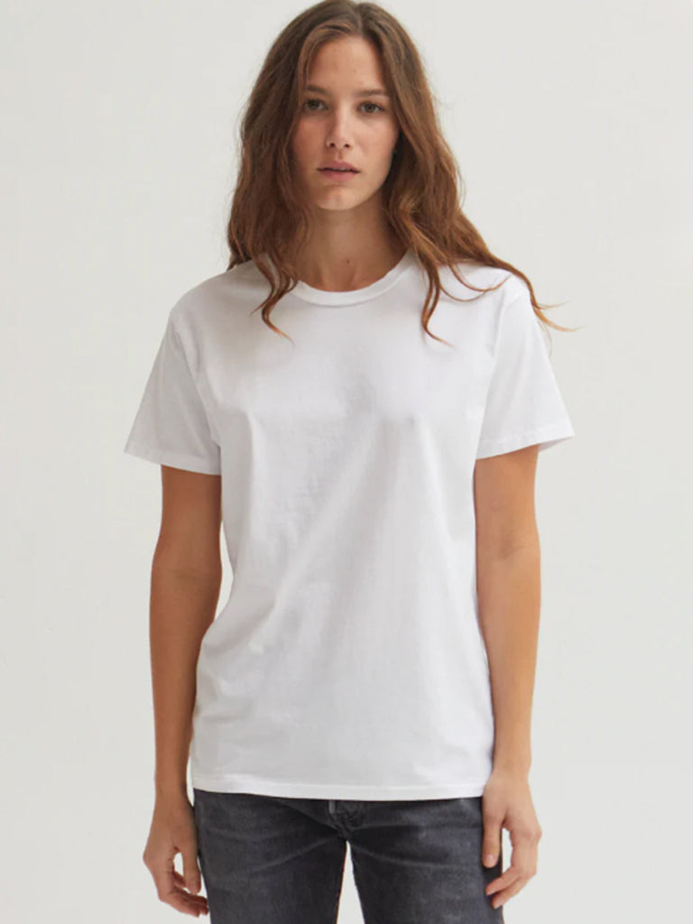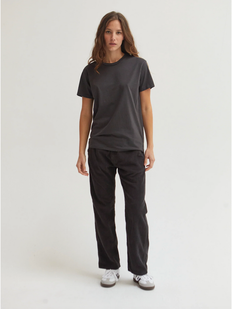 Classic women's short sleeve tee, featuring a custom Lux Supima Jersey. Silhouette hits below the waist. Designed to last wear after wear. Garment-dyed and enzyme & silicon washed for a soft hand feel. From yarn to garment, made in LA.