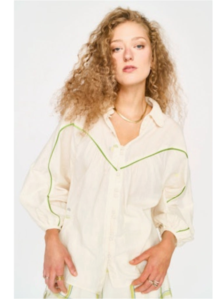 An airy blouse with a wide button cuff and center front button placket. 100% cotton. Made in India