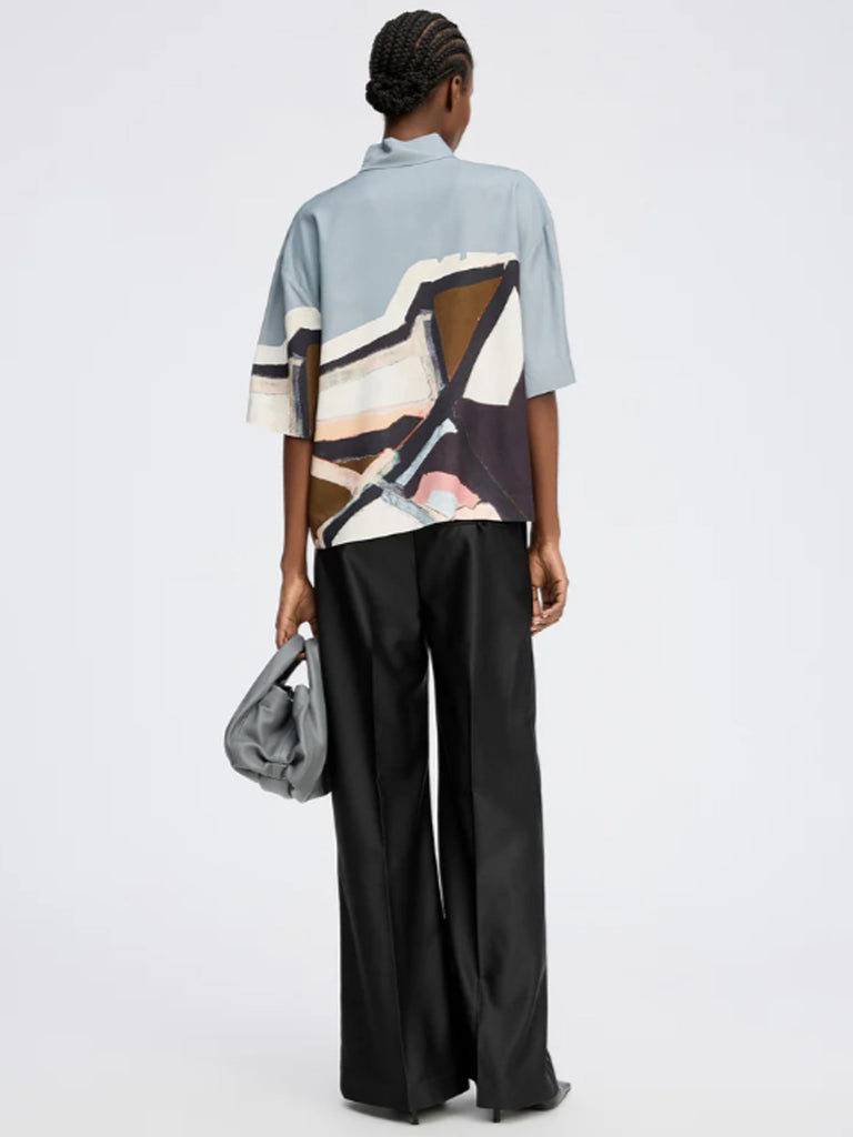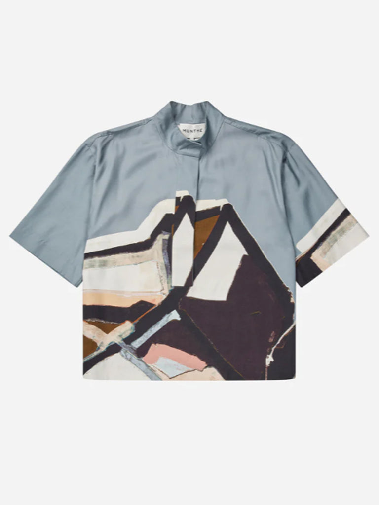 A beautiful shirt blouse with an elegant art print. It is designed with short sleeves, can be opened halfway down, and features a small collar with a fine button closure detail. The blouse has a loose fit.