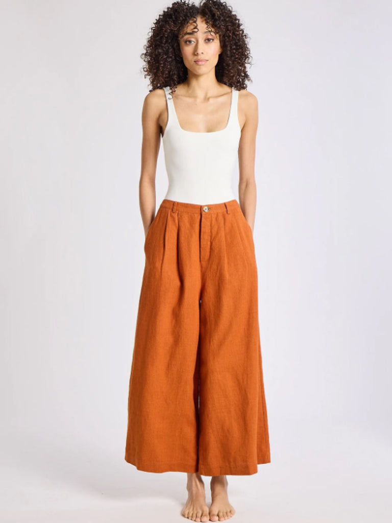 The Avie wide leg, cropped pant has a high rise with a fitted waist and zip fly. Pant has a pleated front, side slash pockets and back welt pockets.