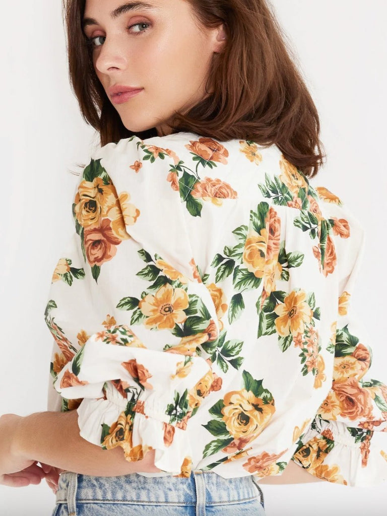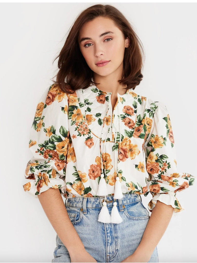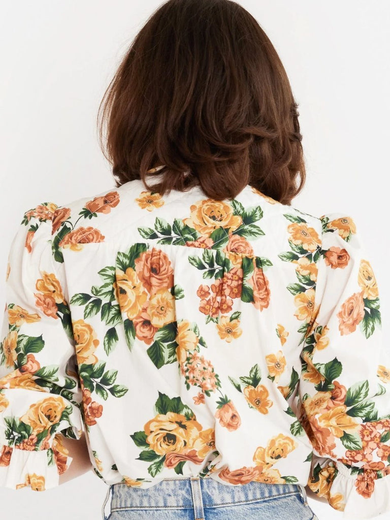 The Guilia top has a loose fitting body with structured shoulders and a quilted bib front. Elasticized cuff with subtle ruffle detail. Available in Antique Rose Floral. 100% cotton. Made in India.