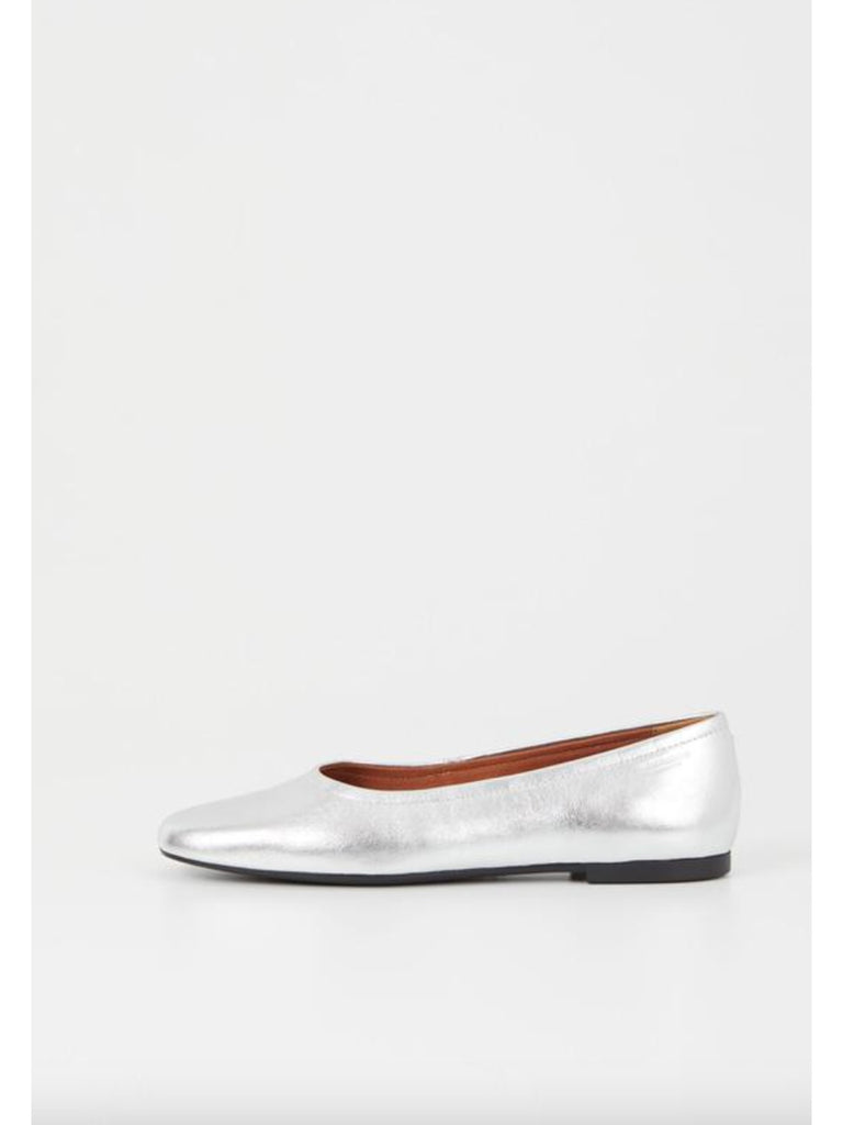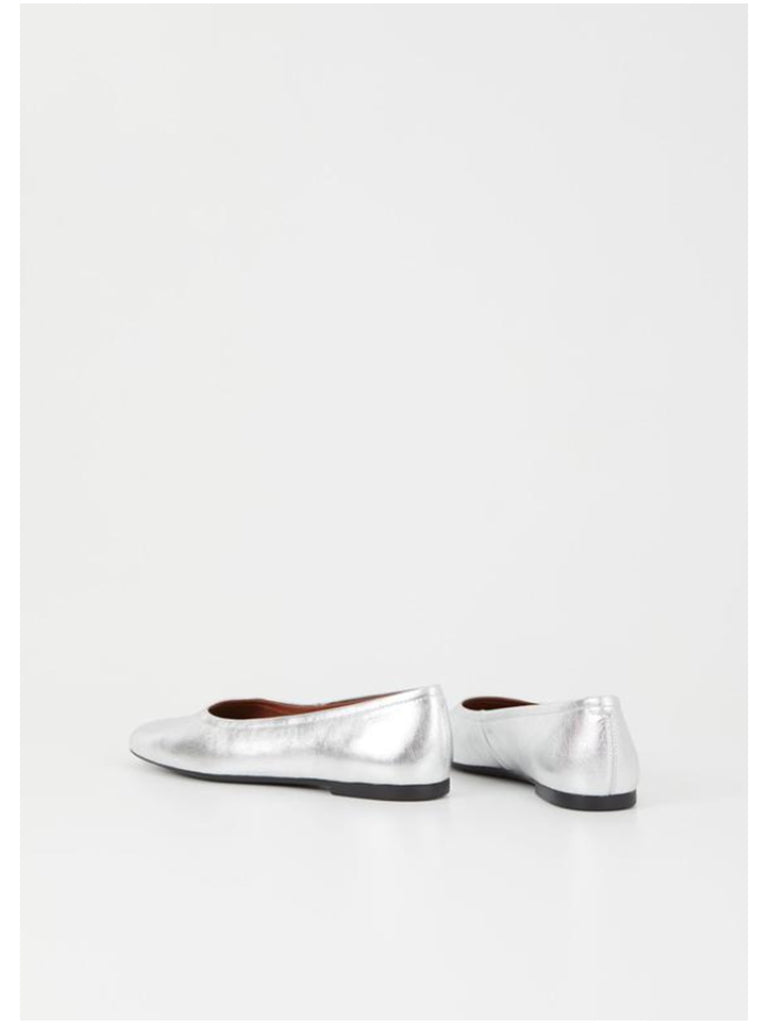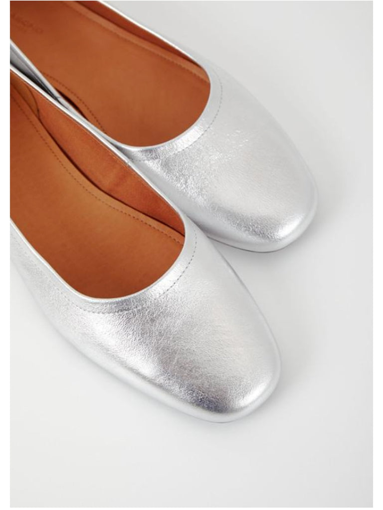 A minimalist ballerina shoes with a timeless silhouette. Silver colored leather with a rounded toe and pretty sole with an .5" low heel. Details include leather lining and leather insoles.