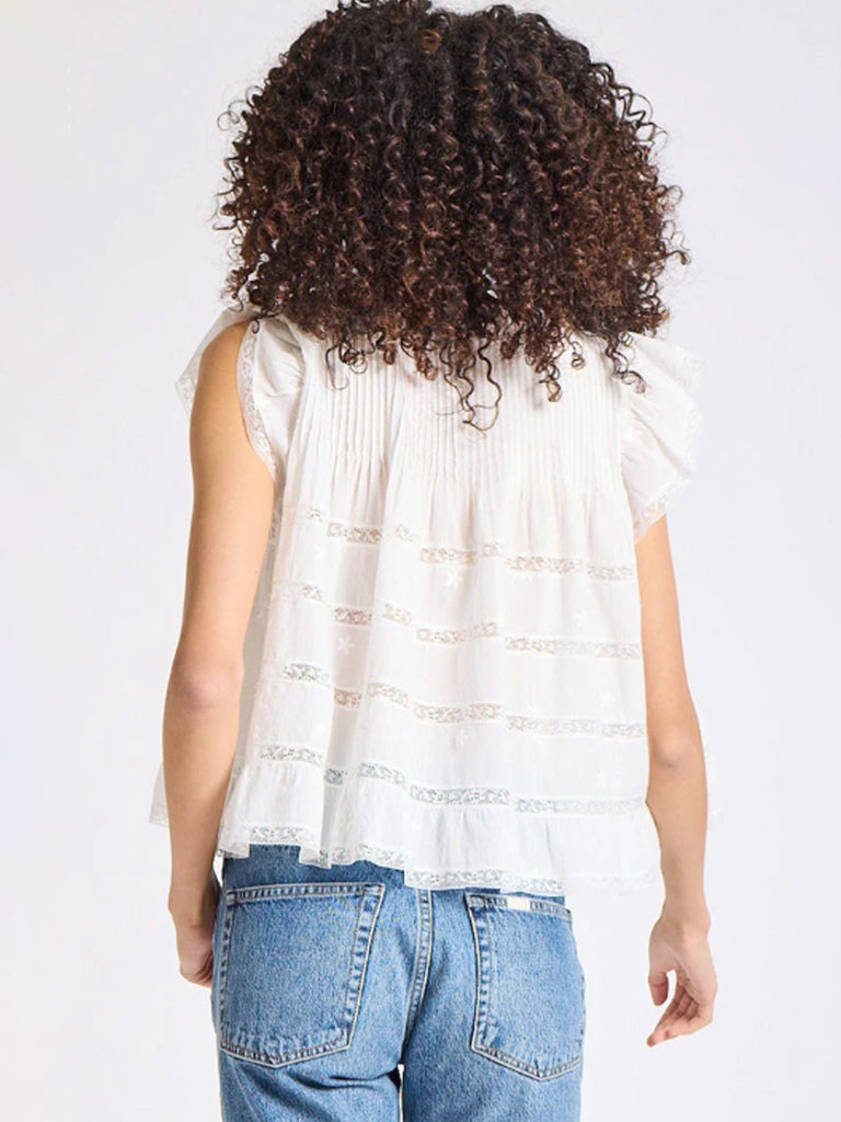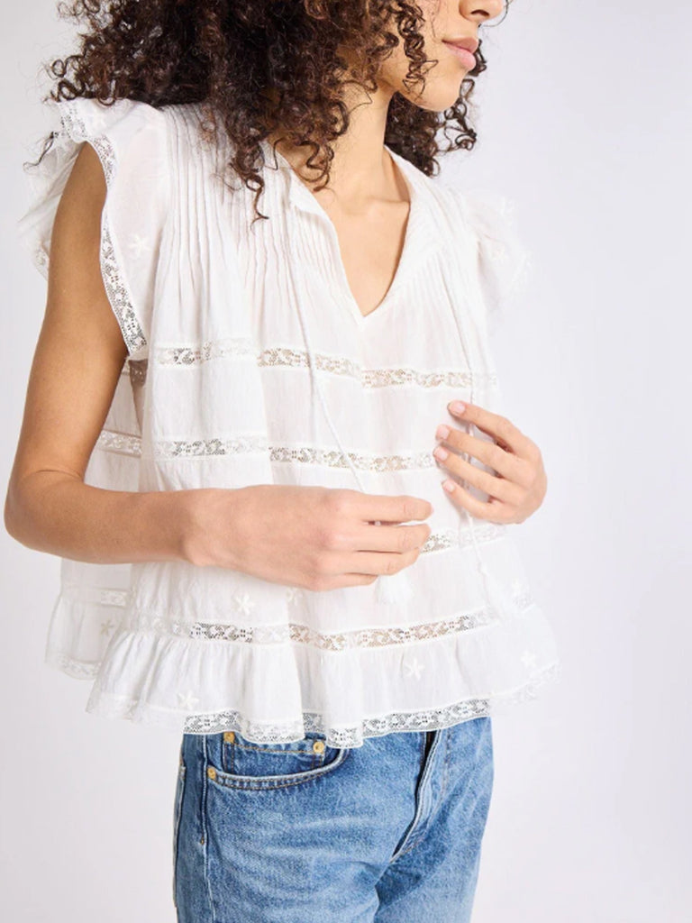 The Maria swing top has a flutter sleeve and tassel tie neck. Pintucks along the shoulder transition to a body decorated with fine lace bands and embroidered flower detailing. Pullover styling.