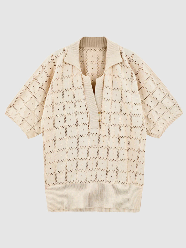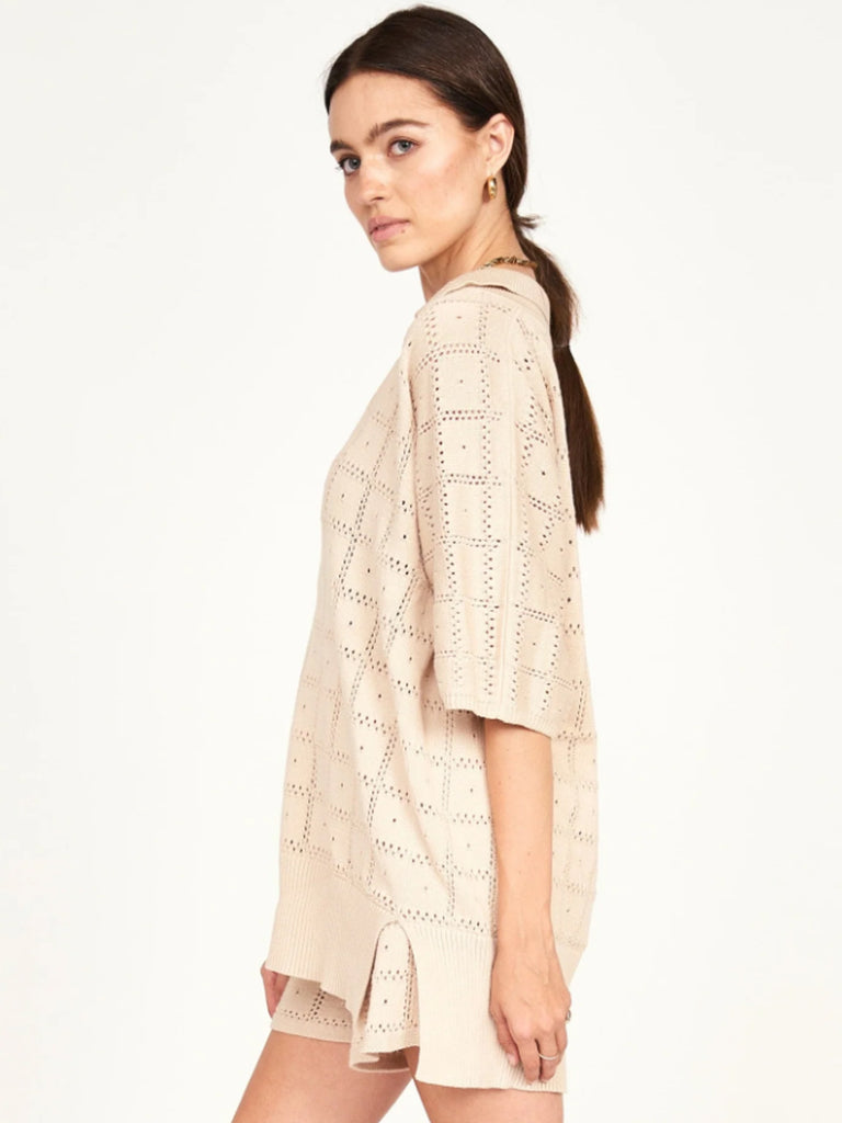 Oversized knit top with drop shoulder and two-button closure. 100% pima cotton knit. Oversized fit. Side slits. Made in India.