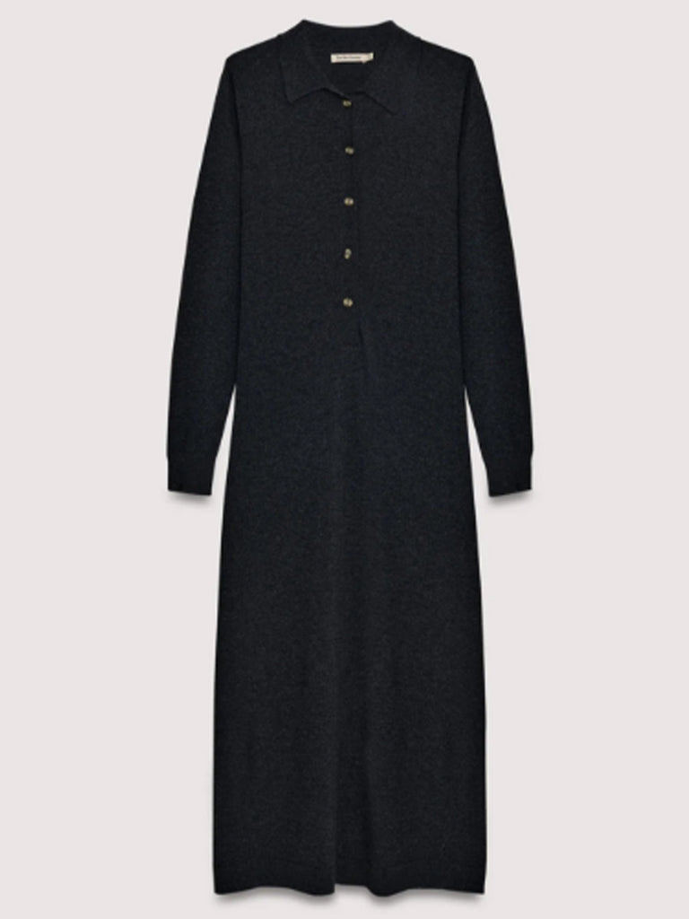 Elegant and cozy, this long dress is crafted from a fine-knit blend of cashmere and wool. It features ribbed cuffs and a ribbed neckline with a placket and buttons, combining timeless style with exceptional comfort.