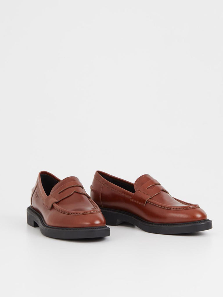 A sleek, everyday penny loafer crafted in cognac brown leather featuring moc-toe details, almond-shaped toes and a traditional penny slot across the vamp. The modern style sets on solid rubber outsoles measuring 33mm. Details include visible stitching along the outsoles.