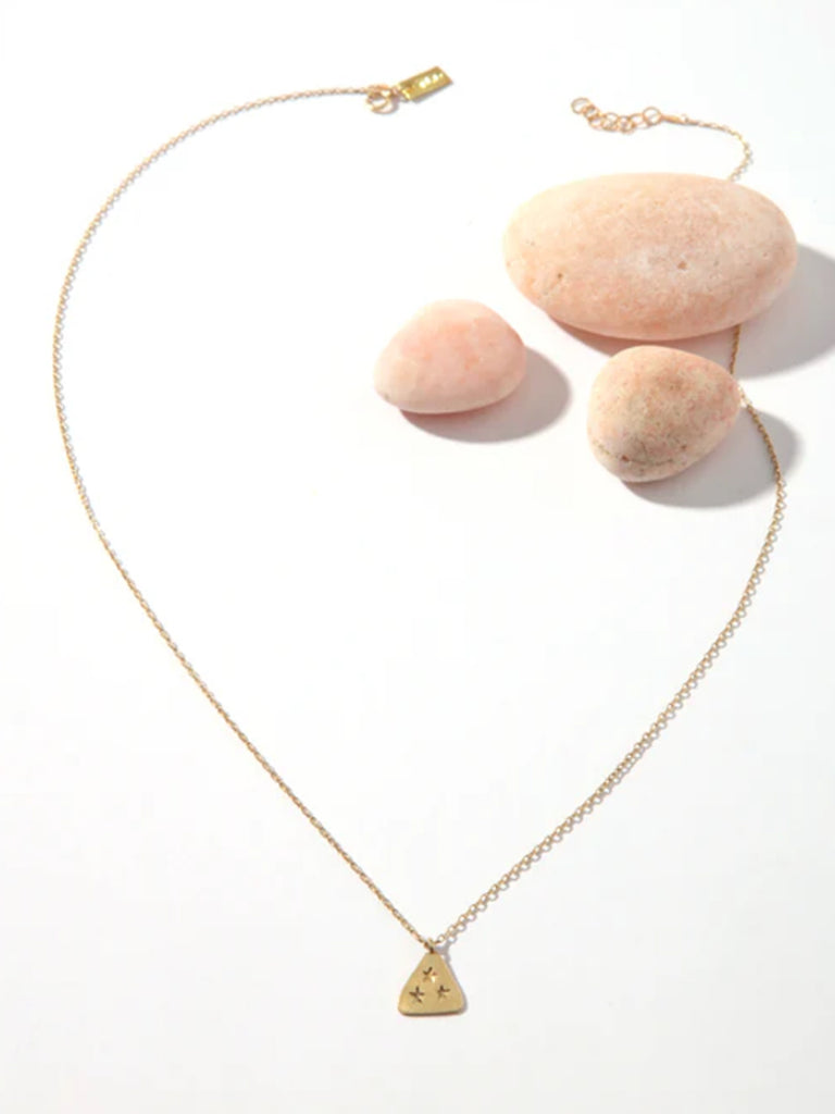 A delicate, star-engraved, pyramid charm hangs from a 18" gold filed chain. Each piece from Iwona Ludyga Design is made with care and skill, catching the spirit of many cultures.