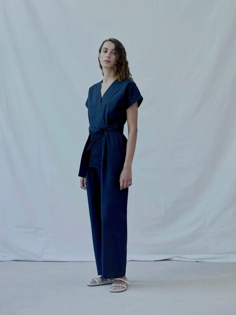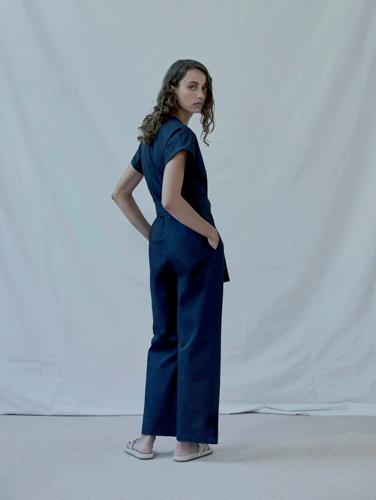 Effortless wrap jumpsuit with deep frontal pleats in cotton-linen twill from Spain. Features side seam pockets, a zipped back and a belt made from the same fabric.