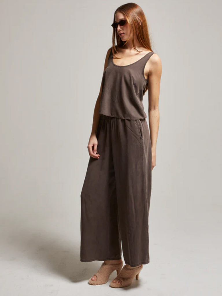 A relaxed trouser in fluid, 100% Tencel—polished enough to dress up, effortless enough to live in. The wide leg and soft drape create a flattering silhouette, while the elastic waistband keeps things easy. Garment-dyed and enzyme-washed for rich color and an ultra-soft finish. Now in chocolate—a seasonless neutral made for slow mornings and last-minute plans.