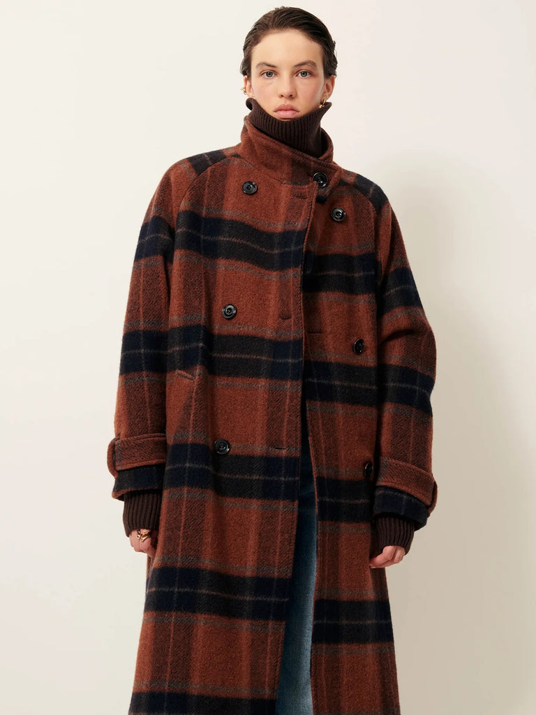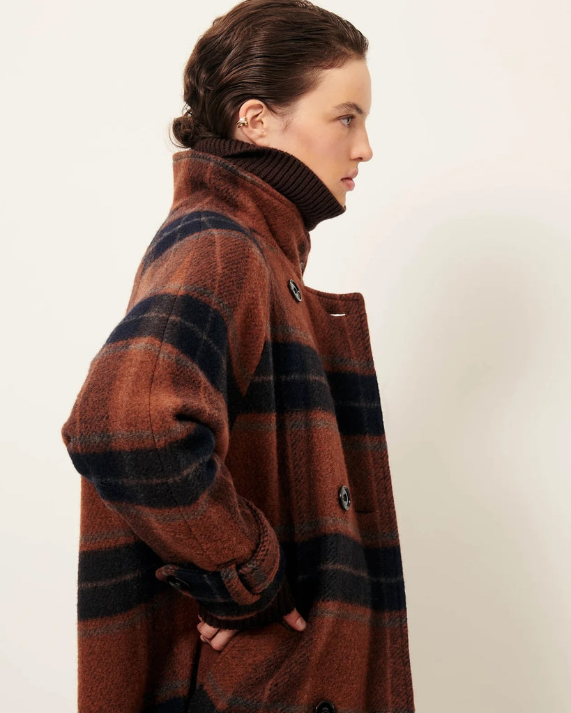 Long double-breasted coat with a high collar in double twill wool with tartan checks, brushed on the right side, woven in Italy.