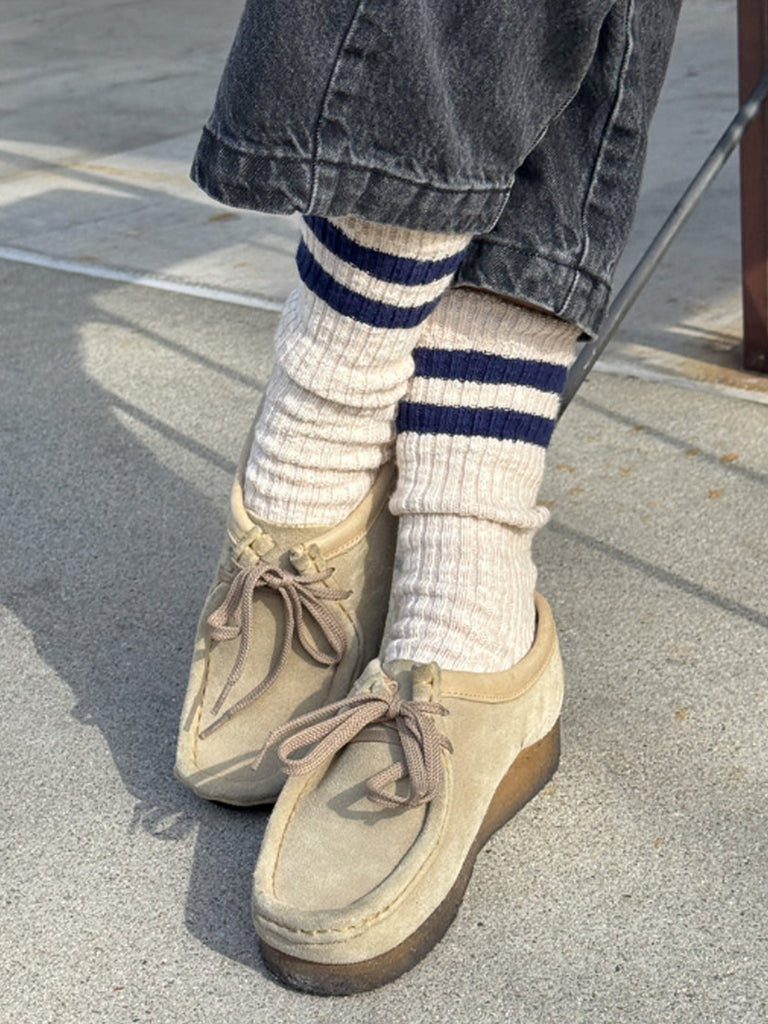 Everyone's favorite chunky knit sock, now with a modern athletic twist. The Cottage Varsity Socks are exactly what they sound like—rustic, cozy cotton blend socks featuring a signature varsity double contrast stripe. Style them slouchy with flats or pair them with your favorite sneakers for a laid-back look.