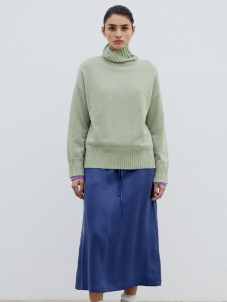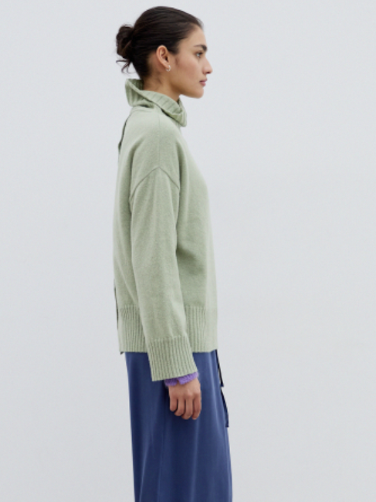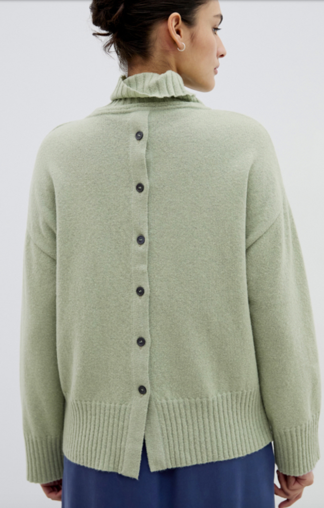 Loose boxy sweater in jersey knit with buttoned back opening. Knitted in soft and lightweight Italian alpaca blend yarn. Made in Spain.