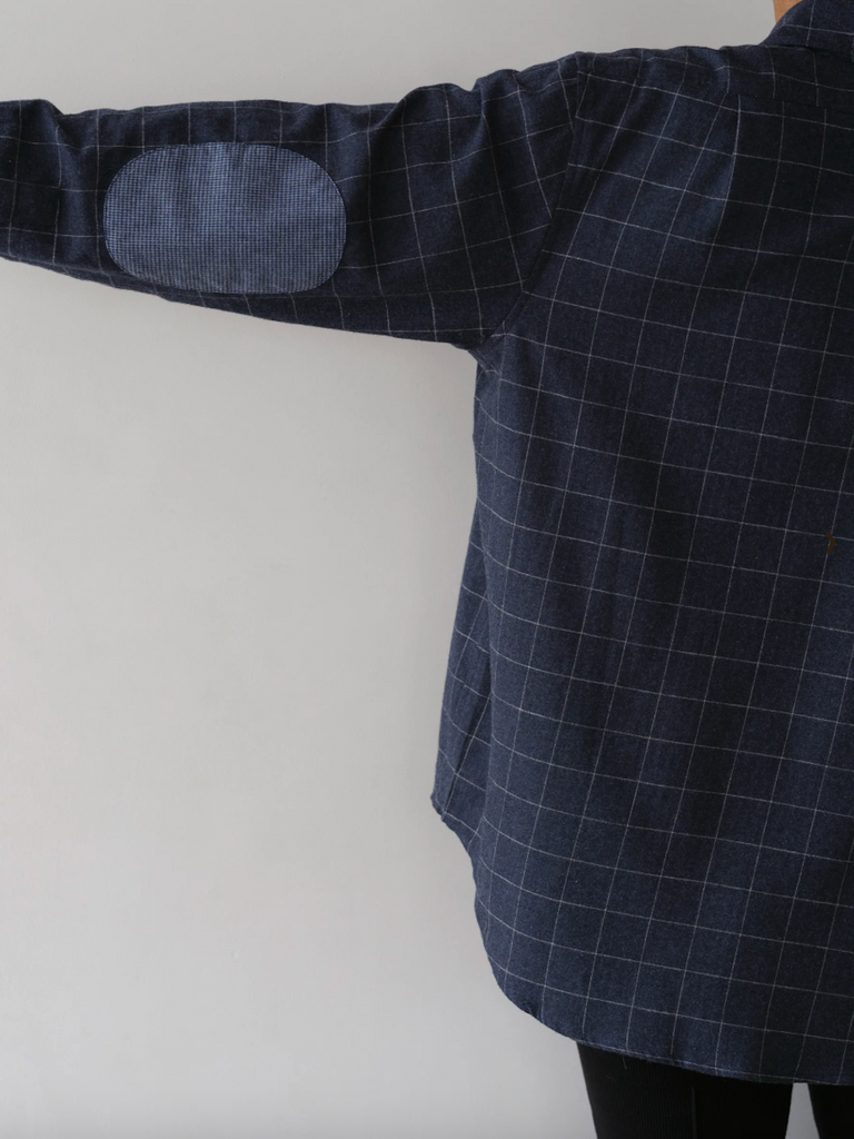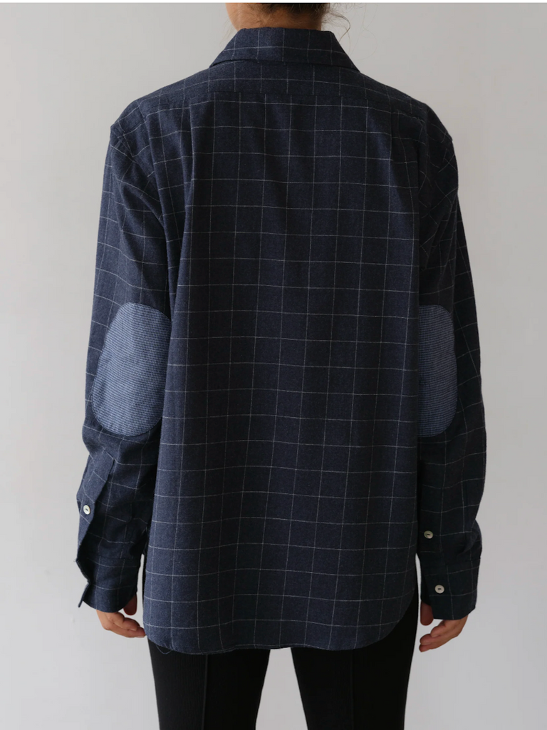 The Flannel Windowpane Shirt is crafted from 100% cotton and features a back yoke with double pleats, front square pocket, pleated cuffs, and mother-of-pearl buttons. Designed with a classic windowpane pattern and finished with contrast herringbone elbow patches.