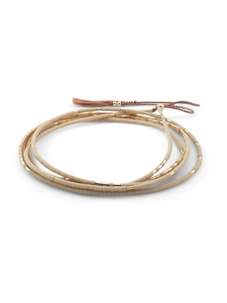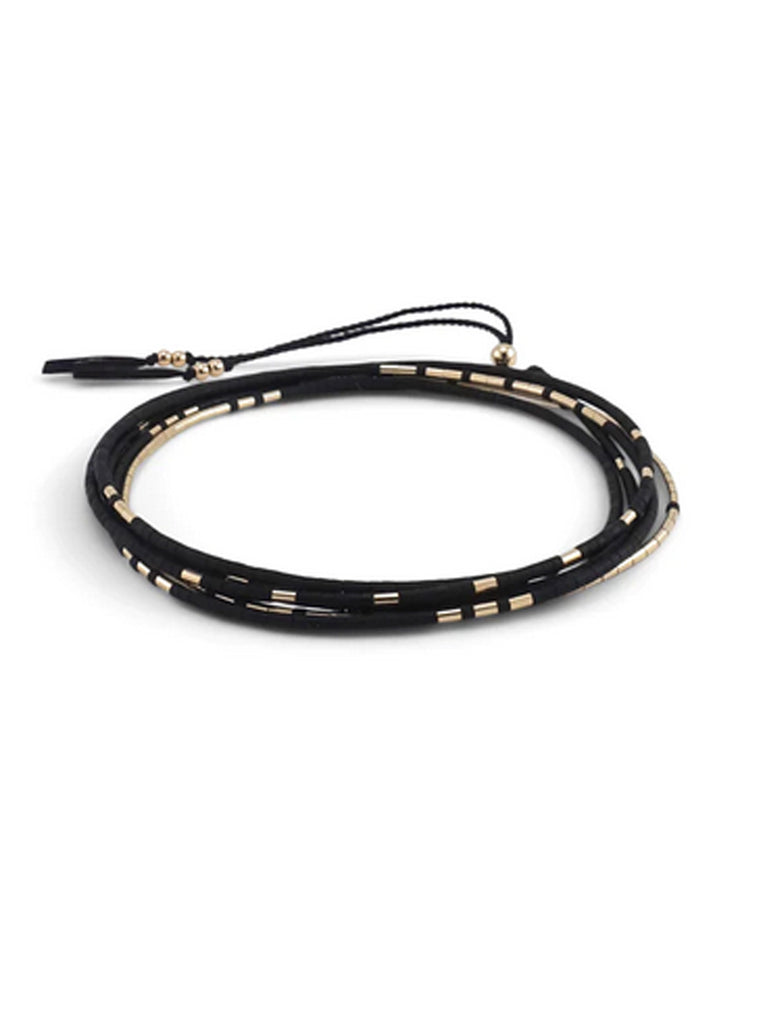 The Neso design beautifully highlights the continuity between the matte glass and gold beads that define this collection. As with all of our wraps, this piece is intended to be worn as a necklace or bracelet, and each piece is uniquely patterned so that no two are identical.