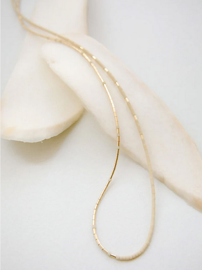 Materials – Japanese Miyuki matte glass beads, 14k gold-filled beads and findings, silk cord