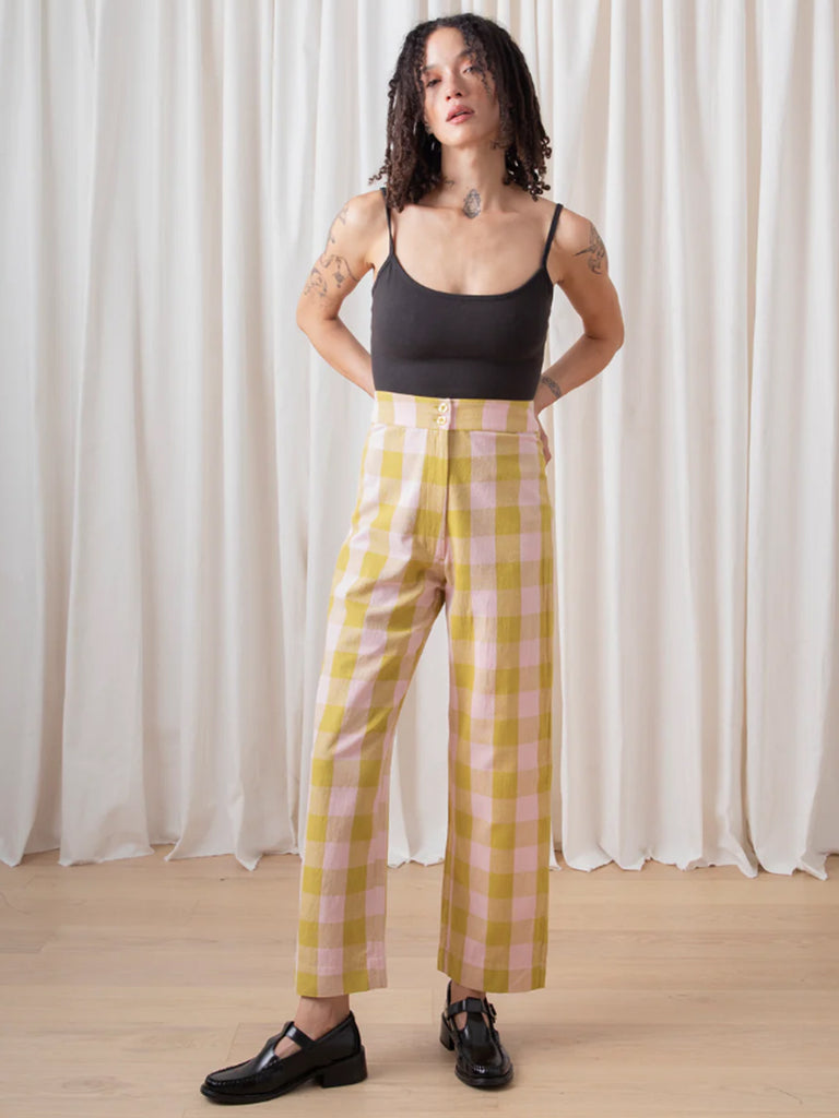 Raw silk high-rise pants in with fly-front zip closure and buttons at waistband. Fitted at waist with slightly relaxed hips and straight leg. Back patch pockets.